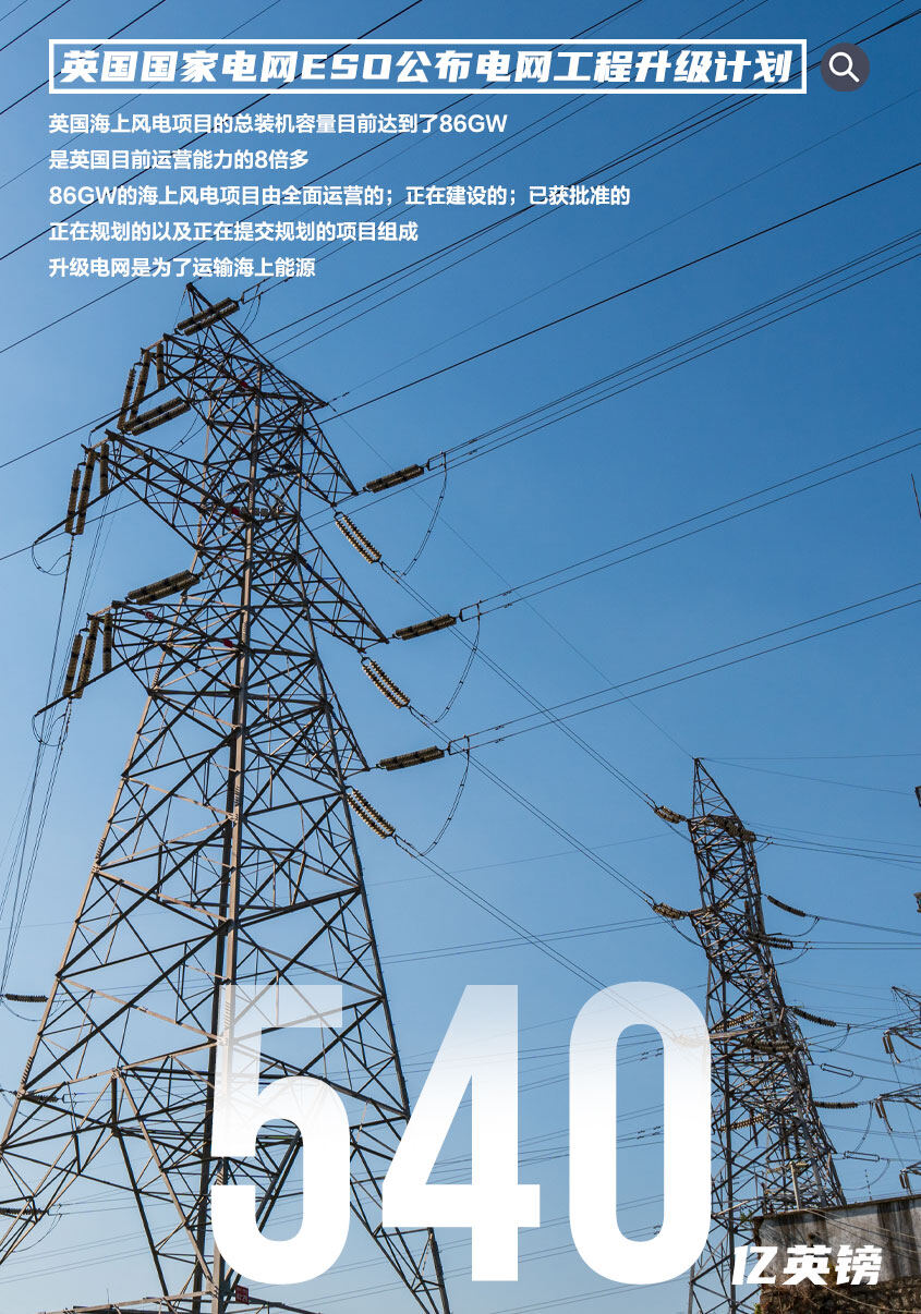 总部位于英国的国家电网电力系统运营商ESO公布了一项价值540亿英镑的计划,以升级该国的电力网络,应对海上风能的快速扩张。政府计划到2030年将海上风电装机容量从目前的10GW增加到50GW。升级后的新网络预计将满足23GW的额外容量。