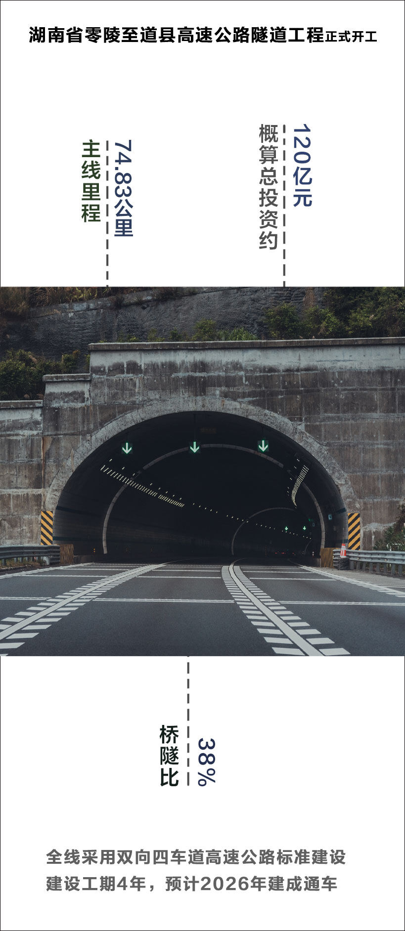零道高速公路起于零陵区富家桥镇,北接永零高速,南至厦蓉高速,路线纵贯零陵区、双牌县和道县,主线里程74.83公里,桥隧比38%,概算总投资约120亿元,全线采用双向四车道高速公路标准建设,建设工期4年,预计2026年建成通车。