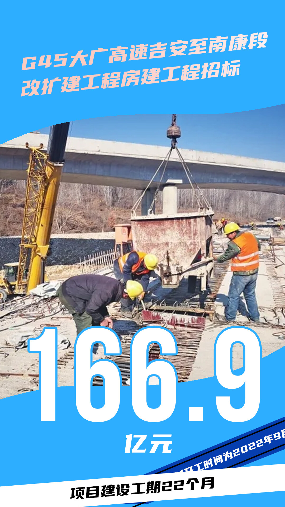 2022年7月14日,江西省交通运输厅发布G45大广高速吉安至南康段改扩建工程项目房建工程施工招标公告,所属行业房建,招标人为江西省交通投资集团有限责任公司项目建设管理公司,项目批复概算166.9亿元。