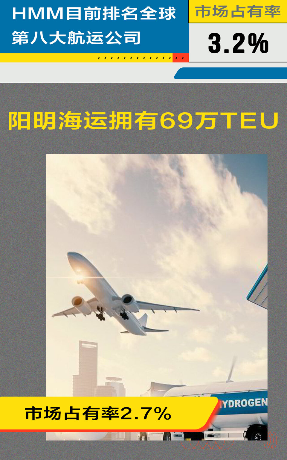 Alphaliner的最新统计数据显示,HMM目前排名全球第八大航运公司,市场占有率3.2%,高于排名第九的阳明海运。目前,阳明海运拥有69万TEU,市场占有率2.7%。