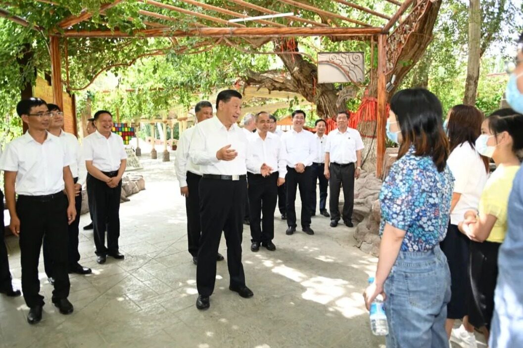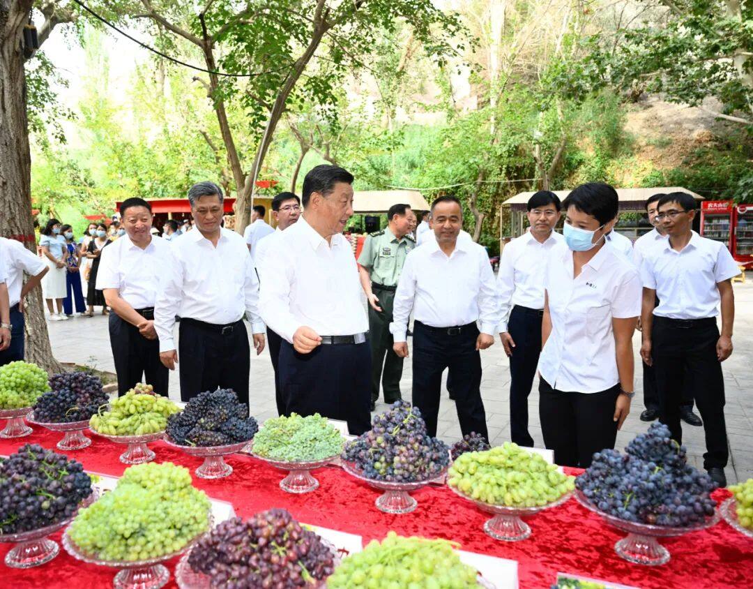 2022年7月14日下午,习近平总书记来到新疆吐鲁番市,先后考察了葡萄沟、高昌区亚尔镇新城片区新城西门村、交河故城,了解当地发展特色产业、推进乡村振兴、文化遗产保护利用等情况。(转载请注明见道网www.seetao.com)见道网战略栏目编辑/许生鹏
