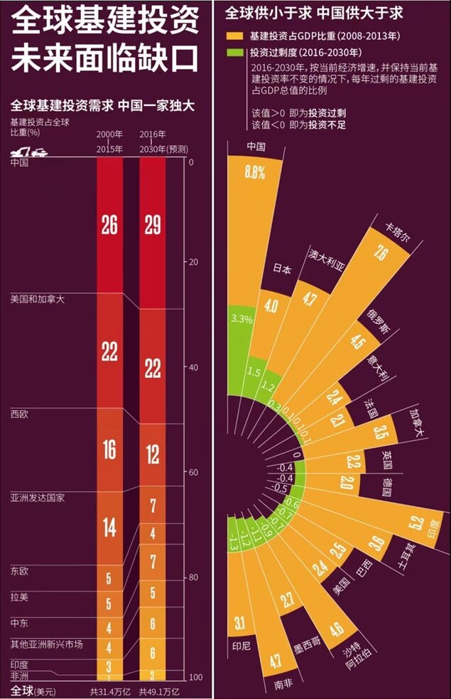 经合组织《2018年商业与金融展望》称,每年全球基础设施投资需求在2.9万亿美元至6.3万亿美元之间。麦肯锡全球研究所估计,到2030年,每年需要3.3万亿美元的基础设施投资才能满足当前的GDP增长预期。亚洲开发银行表示,到2030年,仅亚洲地区就需要26万亿美元的基础设施投资。非洲开发银行估计,非洲的基础设施建设每年需要1300亿到1700亿美元,每年的融资缺口高达680亿到1080亿美元。