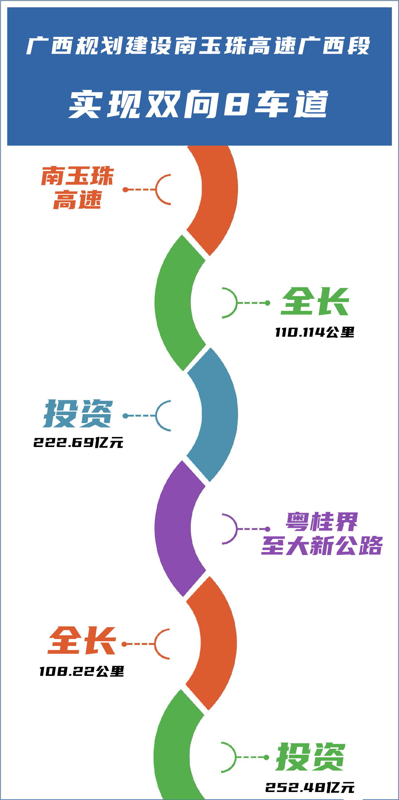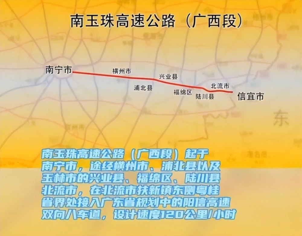 南玉珠高速玉林至粤桂省界起点位于玉林市福绵区成均镇北侧,终点到达粤桂省界,线路长约75公里,这条高速公路并不是全部新建,起点有一小段,约十来公里,即南玉珠高速玉林环城段,是采用原路改扩建的方式达到双向8车道,但最终的目标都是实现双向8车道、时速120公里。