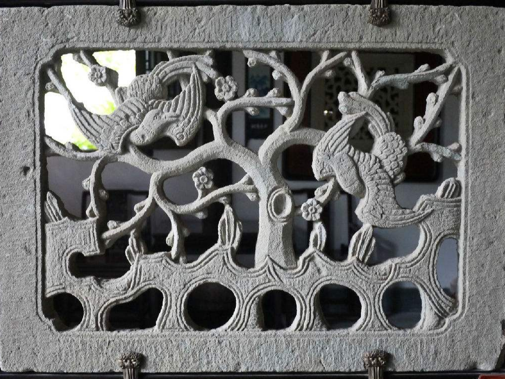 许多石窗的图案还有极强的象征性。譬如以石榴、莲蓬来寓意多子多福,牡丹寓意富贵,灵芝寓意长生不老,松、鹤象征长寿等。还有以谐音来寓事,如莲(连)年有鱼,马上封猴(侯),瓶(平)升三戟(级),喜上梅(眉)梢,三羊(阳)开泰等等,都表达了房屋主人美好的生活愿望。
