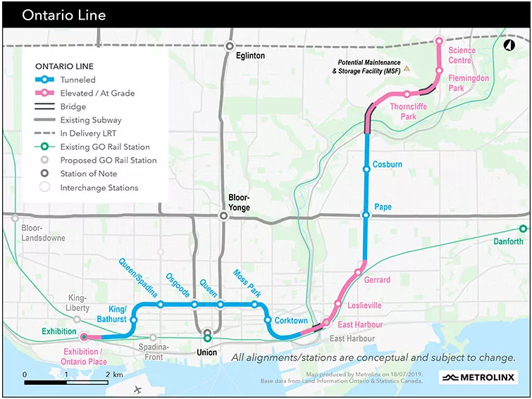 这条16公里长的独立地铁线路将从安大略广场穿过多伦多市中心到安大略科学中心,并将包含15个车站。