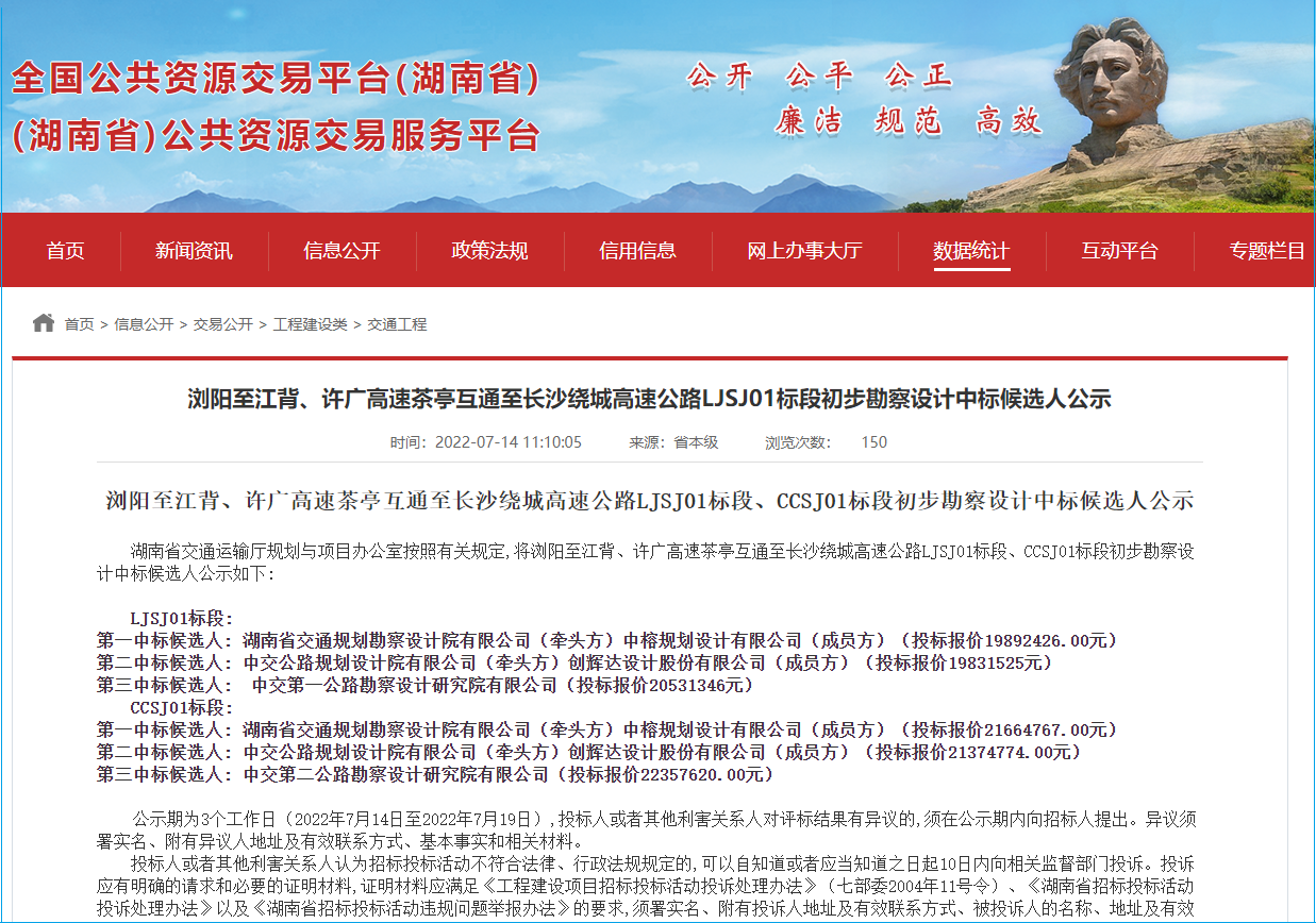2022年7月14日,湖南省公共资源交易平台发布浏阳至江背、许广高速茶亭互通至长沙绕城高速公路初步勘察设计中标候选人公示,项目由湖南省交通规划勘察设计院有限公司联合体中标,项目总投资约90.8亿元。
