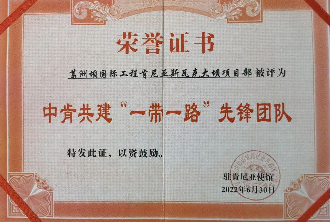 近日,中国驻肯尼亚大使馆开展中肯共建一带一路评优活动,中国能建葛洲坝集团肯尼亚斯瓦克大坝项目部被评为中肯共建一带一路先锋团队,表彰项目在共建一带一路过程中取得的突出成绩。