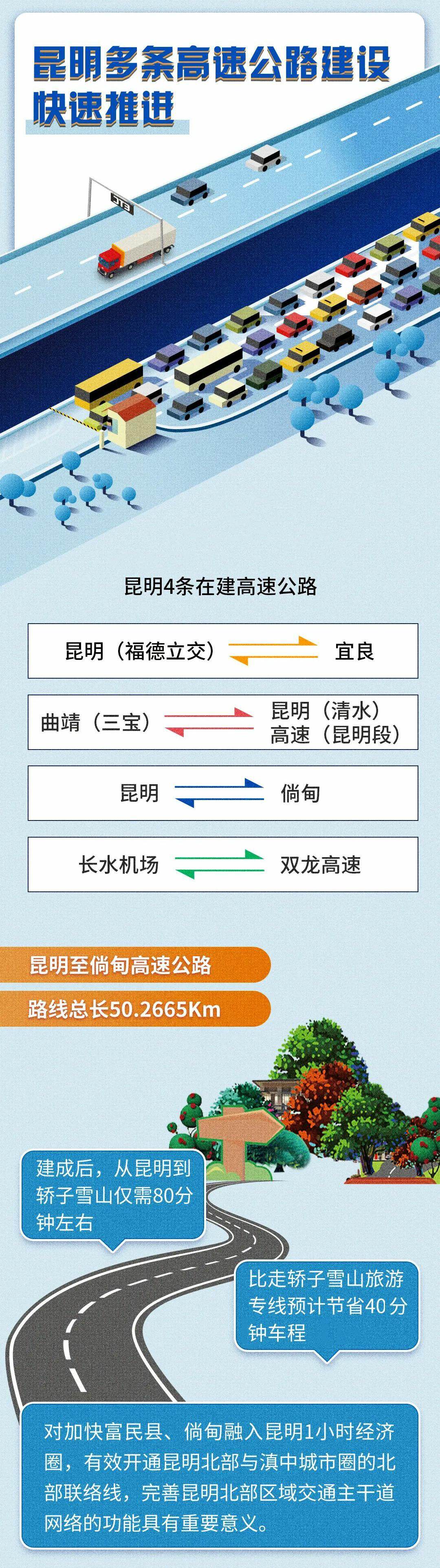 据介绍,昆倘高速公路项目主线起于昆明市五华区小普吉村昆明北三环处,止于昆明市富民县东村镇西北部大团田,设东村十字交叉枢纽与在建的武倘寻高速公路相接。路线总长50.2665千米,桥梁41座,隧道1座,于2019年开工建设。
