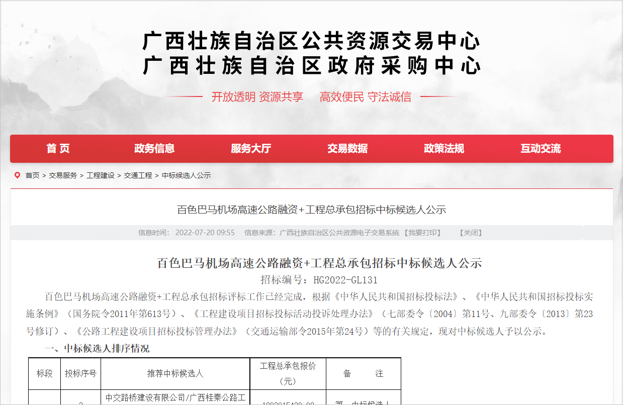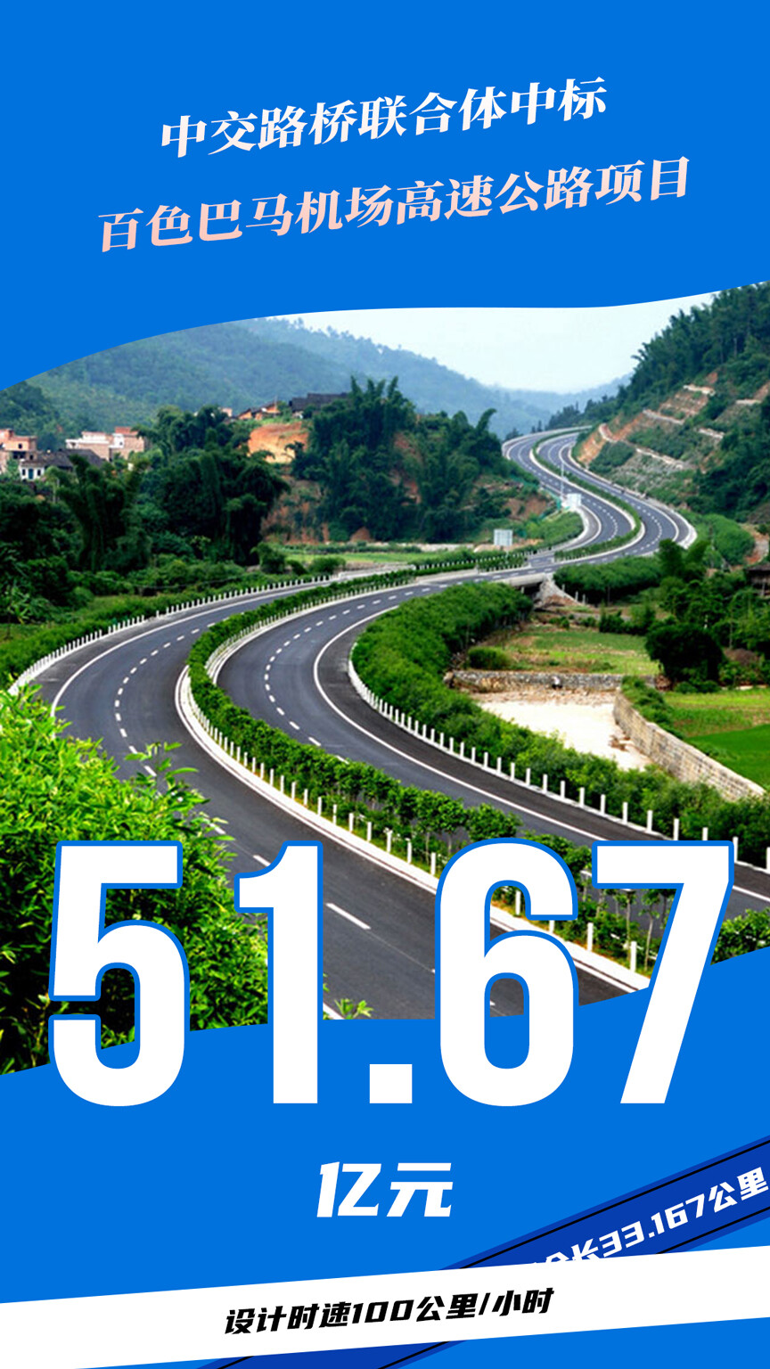 2022年7月20日,广西壮族自治区公共西元交易中心发布百色巴马机场高速公路融资+工程总承包招标中标候选人公示,该项目已由广西壮族自治区发展和改革委员会批准建设,项目投资人为广西交通投资集团有限公司,项目概算总投资额约为51.67亿元。