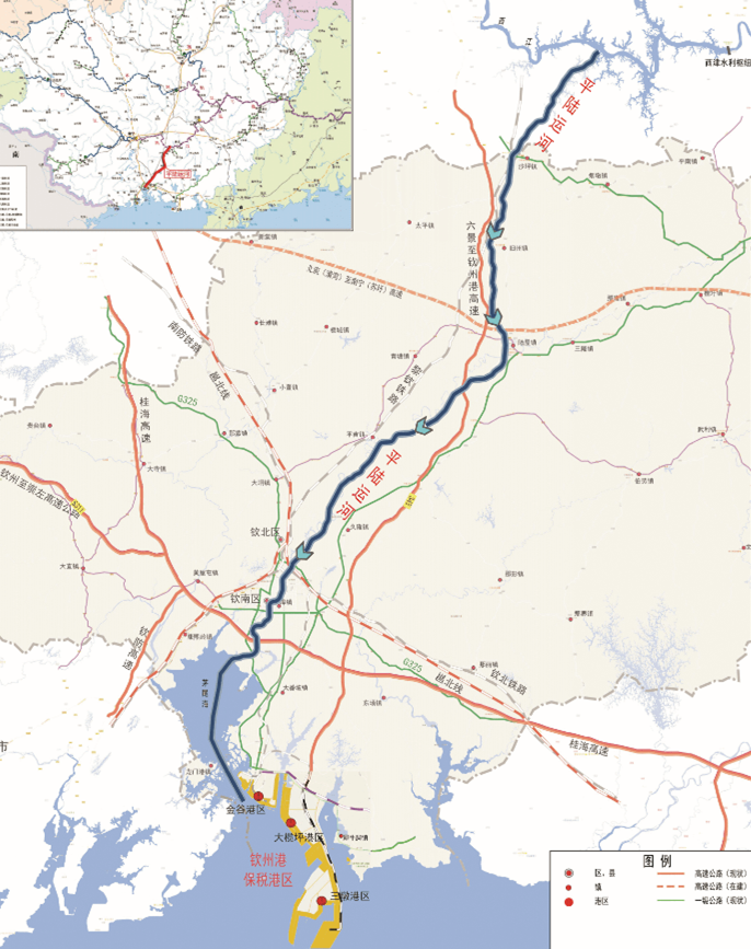 平陆运河开发任务以发展航运为主,结合供水、灌溉、防洪、改善水生态环境等。平陆运河始于南宁横州市西津库区平塘江口,经钦州灵山县陆屋镇沿钦江进入北部湾,全长约135公里,按内河I级航道标准建设,通航5000吨级船舶,主要建设内容包括航道工程、航运枢纽工程、沿线跨河设施工程以及配套工程等,项目估算总投资约727亿元。