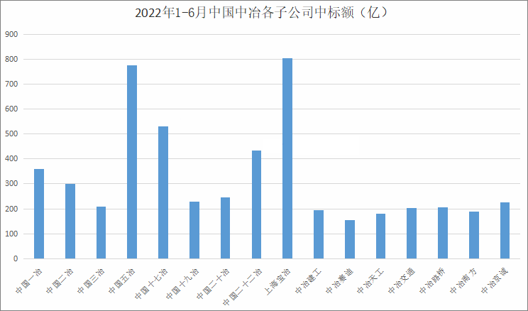 下图是基建通大数据统计的2022年1-6月中国中冶各子企业的中标情况,通过该图可以看到,上海宝冶、中国五冶、中国十七冶、中国二十二冶、中国一冶、中国二十冶、中冶京诚、中国十九冶等排在前列。