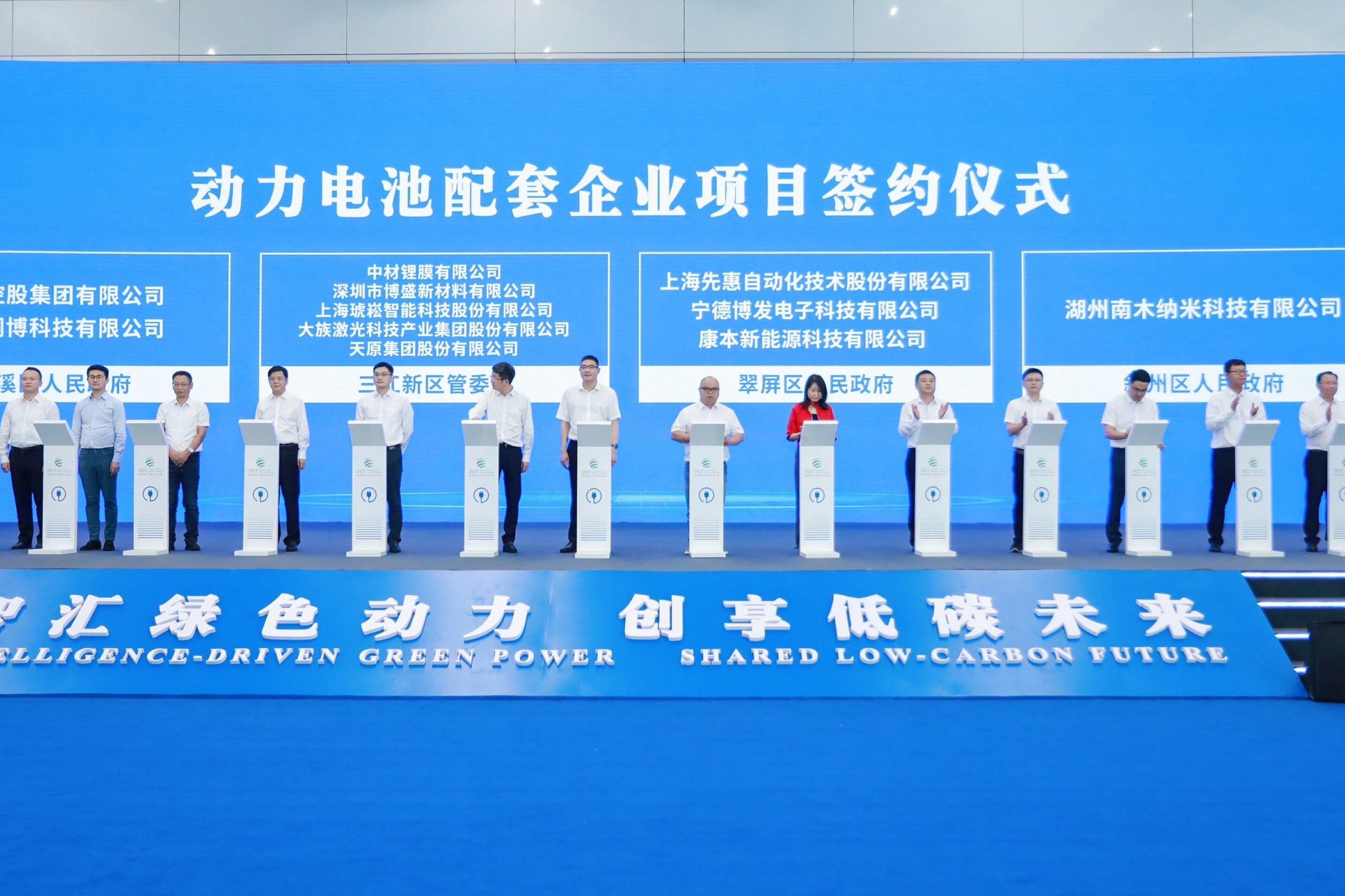 从细分领域来看,动力电池配套项目38个,总投资928亿元,其中正极材料项目4个,总投资85亿元;负极材料项目3个,总投资76亿元;隔膜项目3个,总投资250亿元;电解液项目1个,总投资50亿元;铜(铝)箔项目4个,总投资216亿元;结构件项目7个,总投资58亿元;电池回收项目2个,总投资35亿元;其他配套项目14个,总投资158亿元。新能源汽车配套项目10个,总投资34亿元,本次主论坛的压轴环节留给了动力电池项目签约仪式,现场签约企业主要包括中材锂膜、江西铜博、远东控股、大族激光、贝特瑞、上海先惠、香河昆仑、泰州衡川、深圳博盛等知名企业。宜宾签约揭榜挂帅动力电池和新能源汽车科技项目7个。