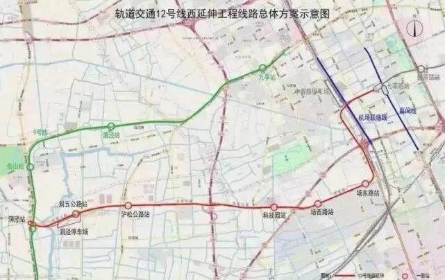 轨道交通12号线西延伸工程起自沈砖公路、嘉松南路路口东南象限地块内洞泾站,终于己建七莘路站,途经松江区、闵行区。线路主要走向:沈砖公路—莘砖公路—莘松路—顾戴路。线路全长约17.3km,均采用地下敷设方式,设洞泾(换乘9号线)、刘五公路、沪松公路、科技园(九科绿洲)、场西路、场东路6座车站,最大站间距约5.5km,最小站间距约1.5km,平均站间距约为2.9km。新建洞泾停车场,选址于沈砖公路、刘五公路路口西南象限地块内。