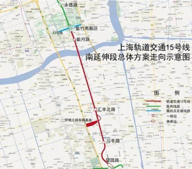 15号线南延伸工程起于5号线南延伸望园路站,终于紫竹高新区站,途经奉贤区、闵行区。线路主要沿航南公路—望园路—莲花南路走行, 线路全长约11.5km,均为地下线敷设方式,共设望园路(换乘5号线、南枫线)、川丰路、汇丰北路、紫月路4座车站,设环城北路车辆基地1座。