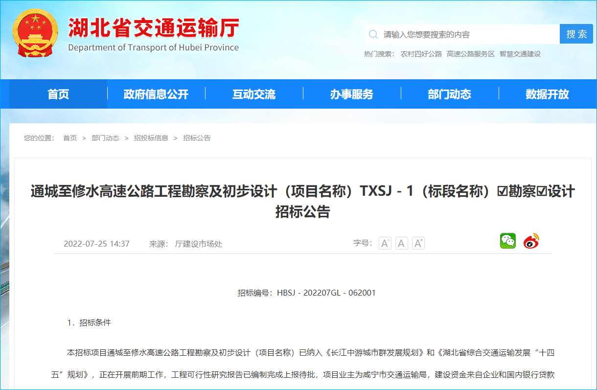 2022年7月25日,湖北省交通厅发布通城至修水高速公路工程勘察及初步设计TXSJ-1标段勘察设计招标公告,本招标项目已纳入长江中游城市群发展规划和湖北省综合交通运输发展十四五规划,招标人为咸宁市交通运输局,项目总投资约为59亿元,其中建安费约为43亿元。