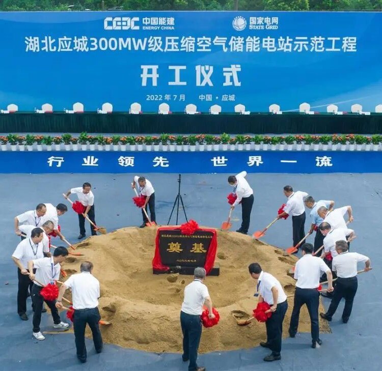 2022年7月26日上午,中国能建主体投资的世界首台(套)300兆瓦级非补燃压缩空气储能示范工程,在应城市举行开工仪式。该工程建成后将在非补燃压缩空气储能领域实现单机功率世界第一,储能规模世界第一,转换效率世界第一。