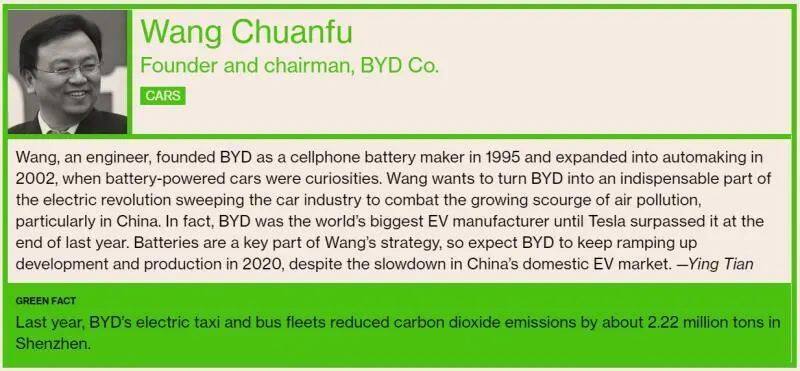 近日,全球最大财经资讯公司彭博社发布2020全球30位环保先锋榜(The Green 30 for 2020),其中,比亚迪创始人兼董事长王传福位列其中,成为榜单中唯一的中国车企领导人,一同上榜的还有微软创始人比尔·盖茨等商业精英。