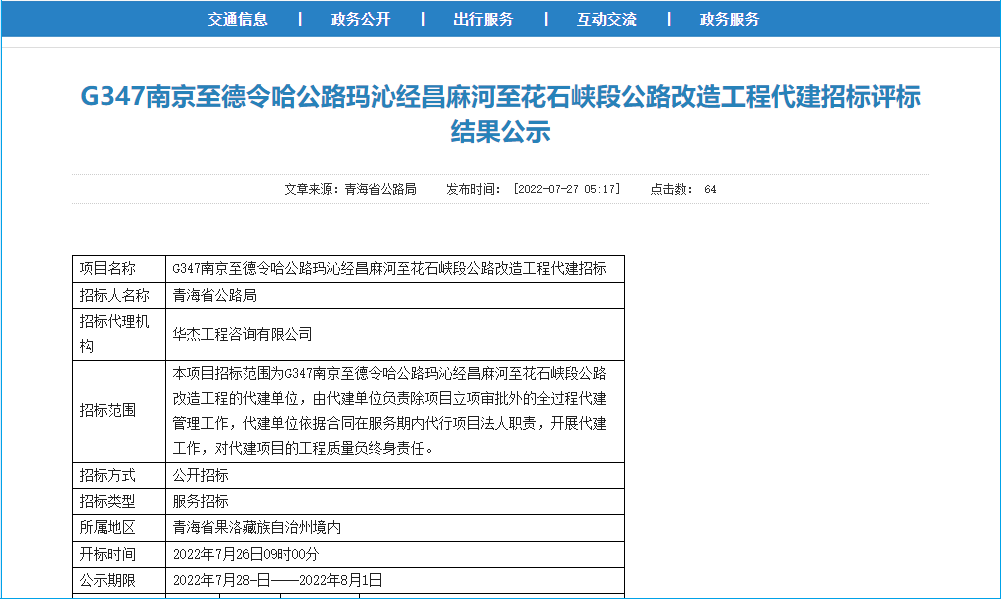 On July 27, 2022, the Qinghai Provincial Public Resources Trading Platform released the results of the bidding evaluation for the construction of the highway reconstruction project of the G347 Nanjing-Delingha Highway Maqin via Changma River to Huashixia. In the autonomous prefecture, CCCC Second Highway Survey and Design Research Institute Co., Ltd. won the bid.