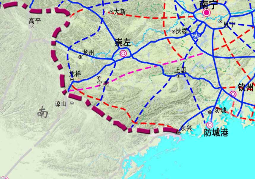 项目概况:项目位于广西西南边境,处于广西崇左市、防城港市辖区内,涉及凭祥市、宁明县、防城区、东兴市等区县市。项目路线总体呈东西走向,起点位于东兴市北侧,与钦东高速公路相接,经防城港市马路镇、那良镇、峒中镇,在峒中镇北侧接入上峒高速,与之共线10.8km穿越十万大山,之后进入宁明县,经过桐棉镇、峙浪乡,在峙浪乡北侧与在建崇爱高速交叉设置枢纽互通,线位在凭祥市上石镇与巴凭高速终点顺接,路线全长154.5公里,共线段长度10.8km,新建里程143.7km。其中在防城港市境内长度为60km,崇左市境内长度为83.7km。