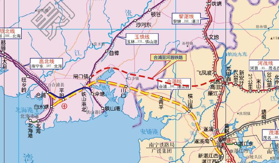 项目概况:线路西起北海市合浦县,向东经铁山港湾、白沙镇、山口镇进入广东省廉江市的青平镇和横山镇,由遂溪县南侧引入茂湛铁路既有湛江西站,并经过联络线与在建广湛铁路的湛江北站连接,正线全长141.655公里,联络线全长38.032公里。项目总投资约238亿元,计划总工期为48个月。