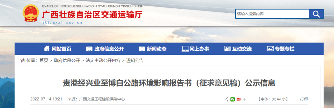 项目进展:2022年7月14日,《贵港经兴业至博白公路环境影响报告书(征求意见稿)》已编制 完成并公示信息。项目投资估算总金额为1439183.78万元,项目计划2022年12月开工,2025年12月完工,计划工期3年。