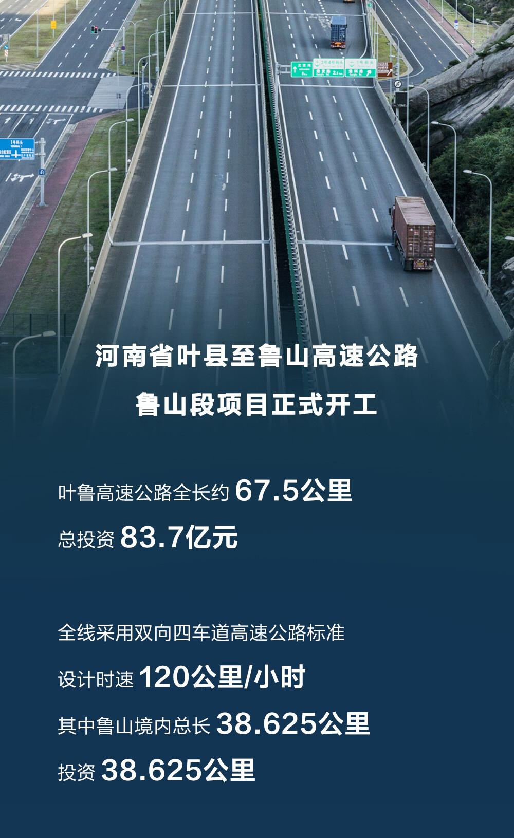 叶鲁高速公路鲁山境内总长38.625公里,投资49.8亿元,共设出口3处,分别为机场出口、张官营镇出口和张良镇开放式服务区。关键词:交通项目建设、基建工程、国内工程项目
