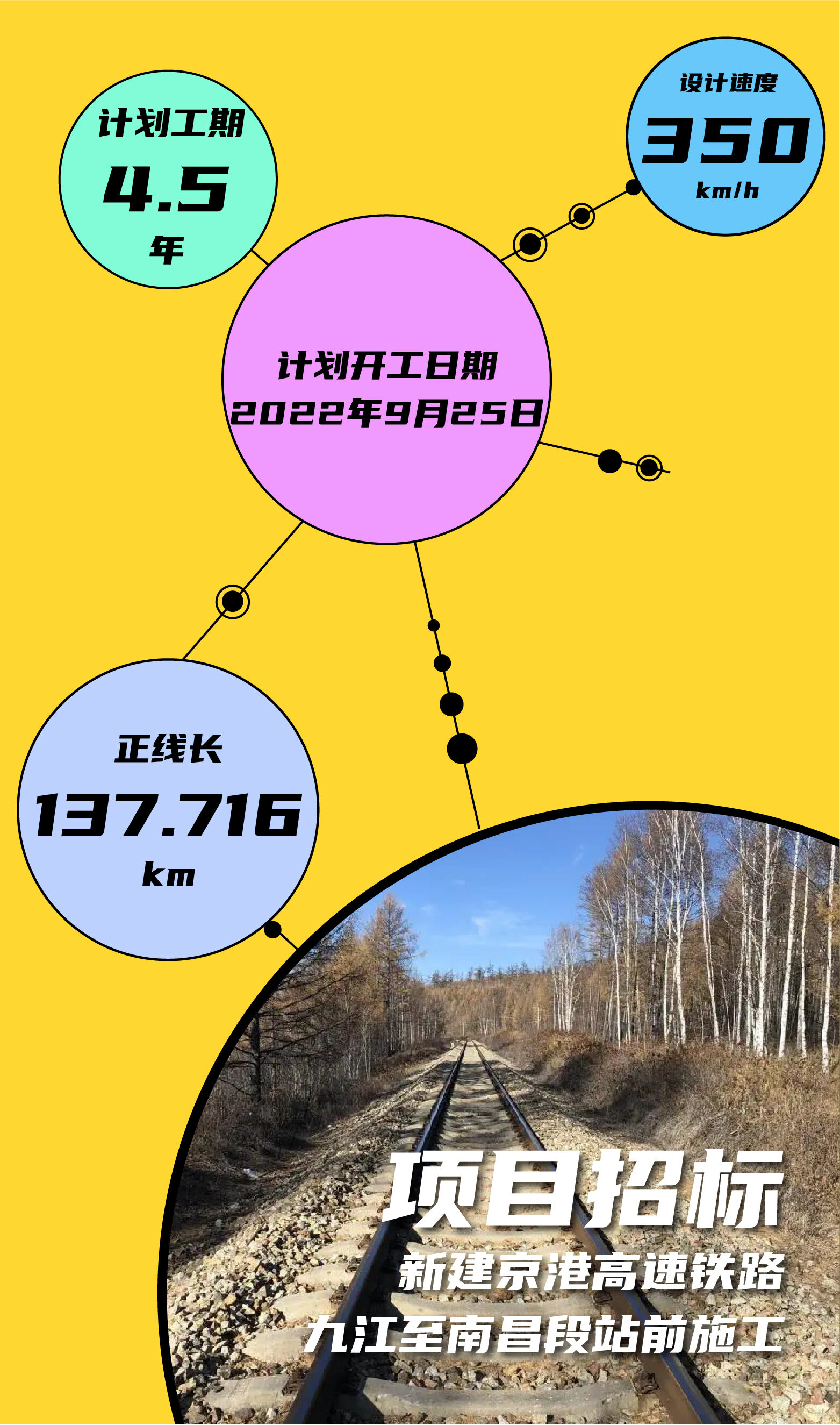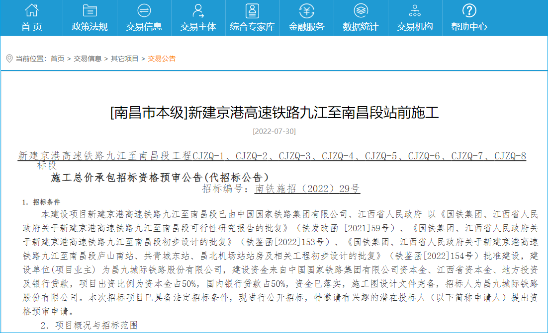 2022年7月30日,江西公共资源交易网发布了《新建京港高速铁路九江至南昌段工程CJZQ-1、CJZQ-2、CJZQ-3、CJZQ-4、CJZQ-5、CJZQ-6、CJZQ-7、CJZQ-8标段施工总价承包招标资格预审公告》。京港高速铁路九江至南昌段即将进入正式施工阶段,根据招标公告,项目计划9月底开工。