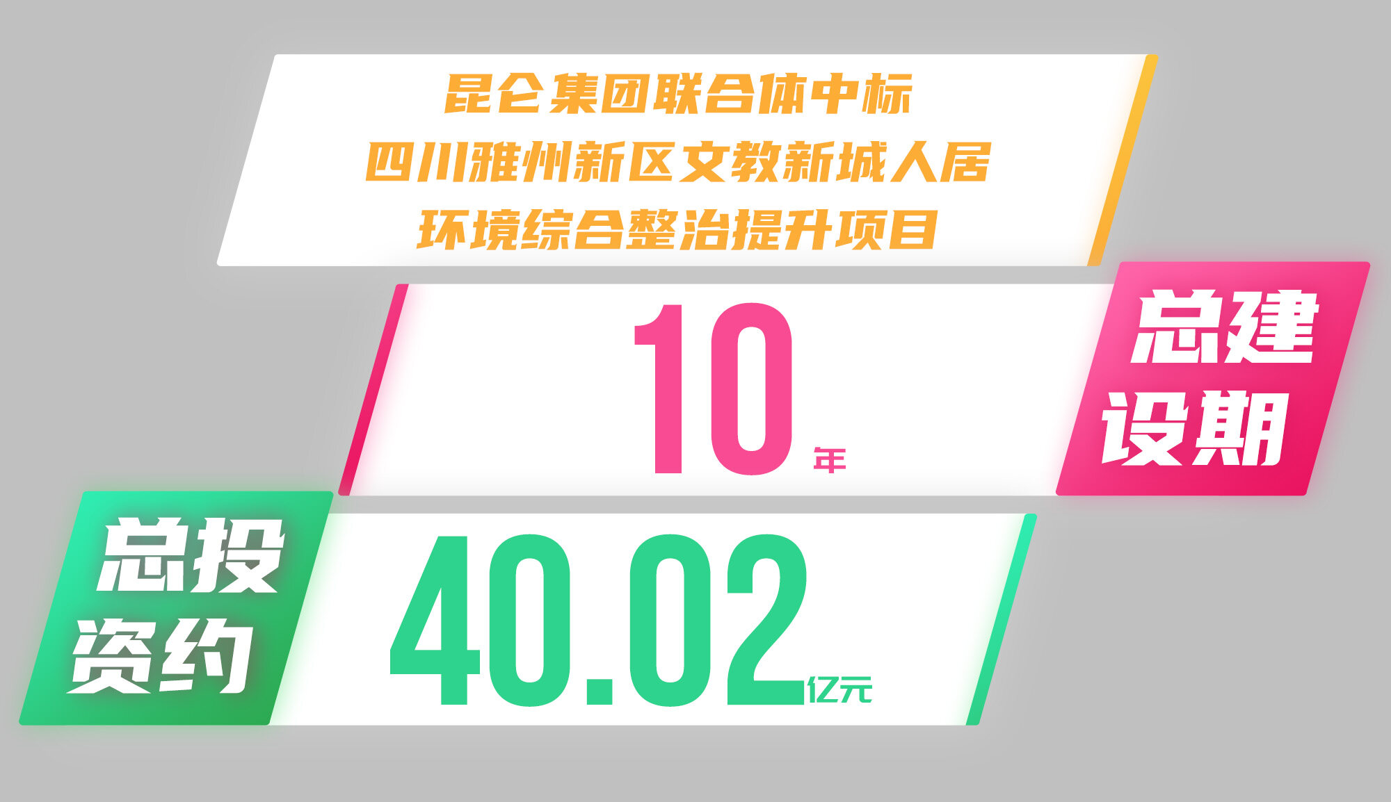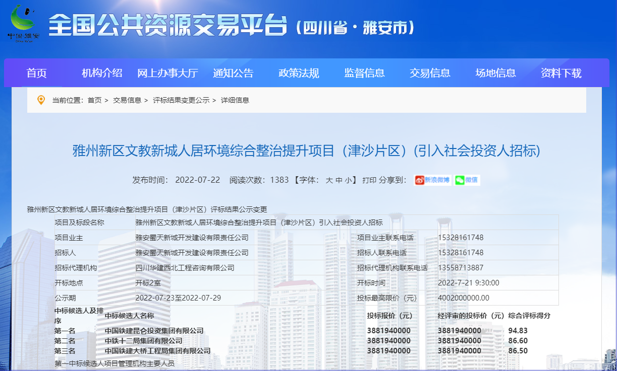 2022年8月1日,雅安市公共资源交易中心发布雅州新区文教新城人居环境综合整治提升项目津沙片区引入社会投资人招标中标公告,项目由中国铁建昆仑投资集团有限公司联合体中标,项目估算总投资额为40.02亿元。