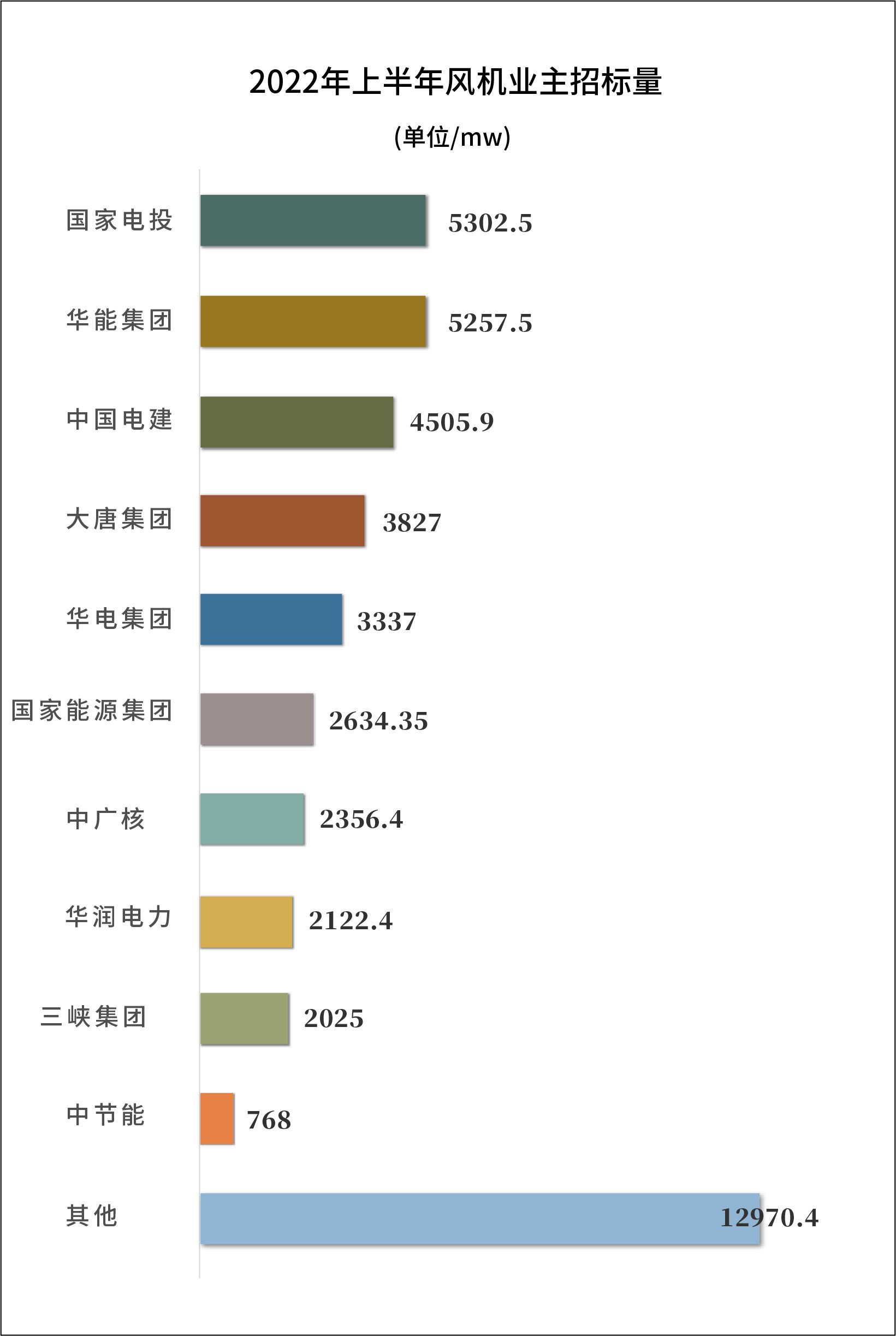 数据显示,2022年上半年国家电投、华能集团、中国电建风电招标量超4GW位列前三,国家电投风电机组招标量5.3GW,华能集团风电机组招标量5.26GW,中国电建风电机组招标量4.5GW。