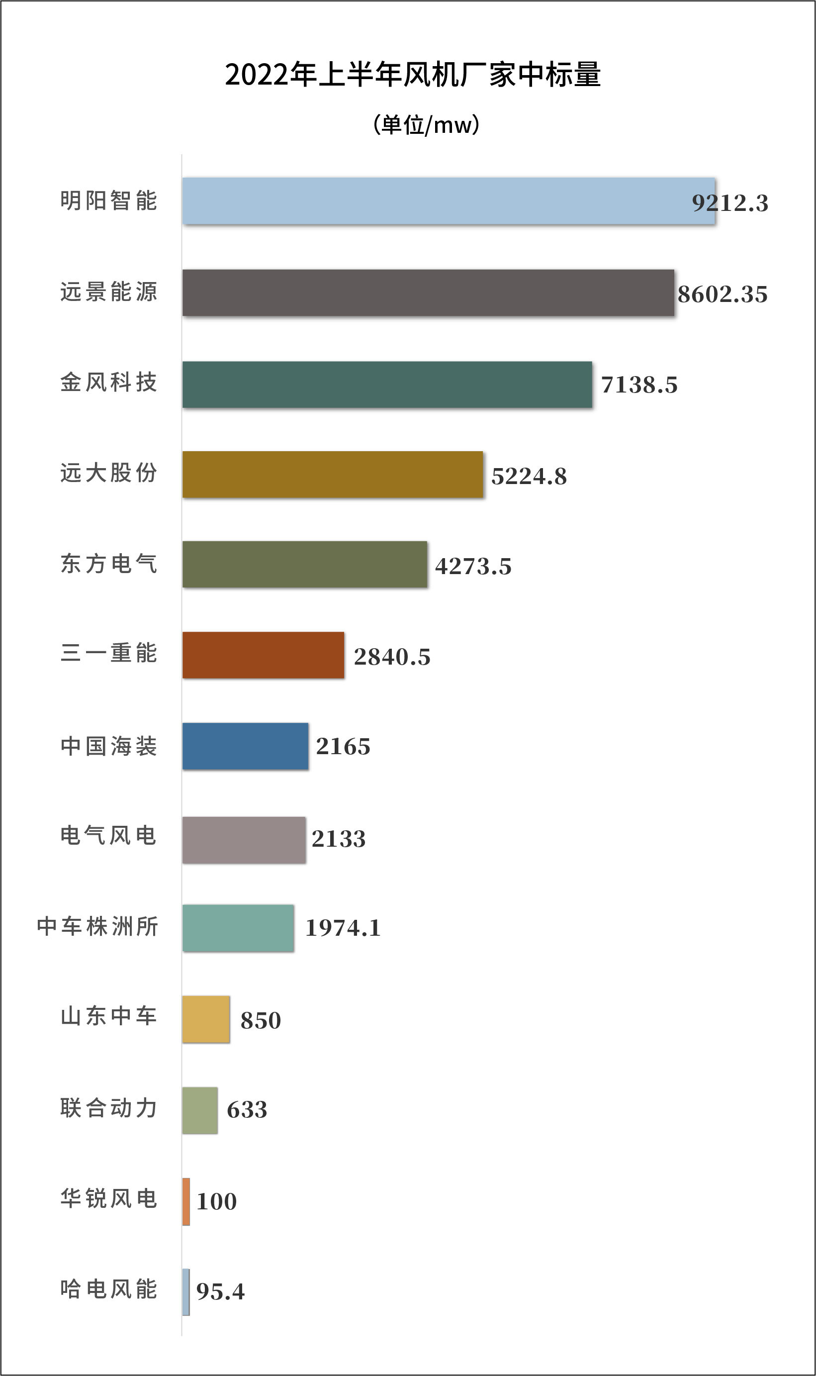 数据显示,2022年上半年,明阳智能中标风机订单量9.2GW,远景能源中标风机订单量8.6GW,金风科技中标风机订单量7.1GW;三家整机企业以高达55.21%的市场占有率位列前三甲。