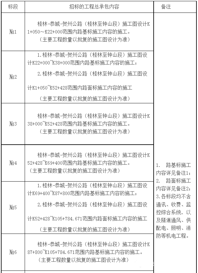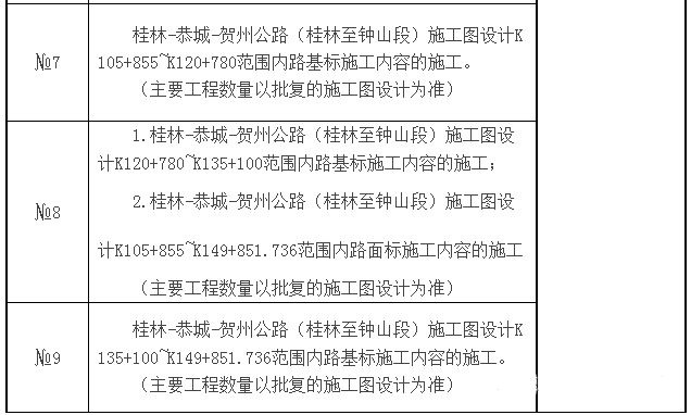 桂林—恭城—贺州公路桂林至钟山段融资+工程总承包分为9个标段,即№1、№2、№3、№4、№5、№6、№7、№8、№9标段,具体见下表: