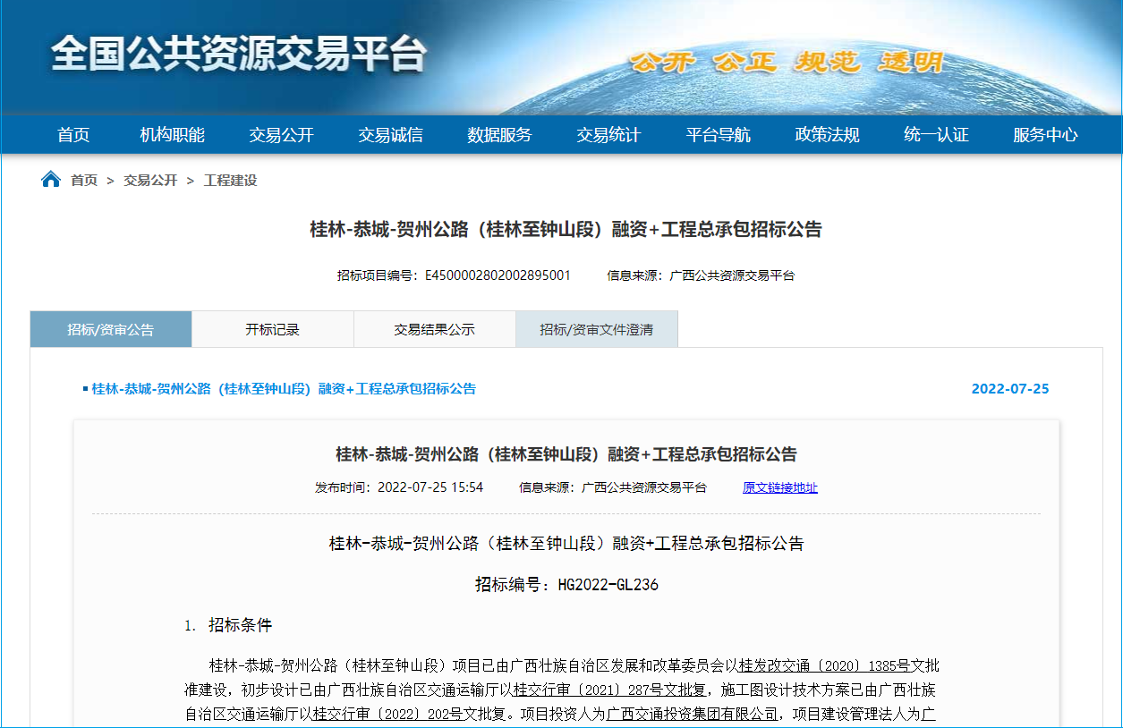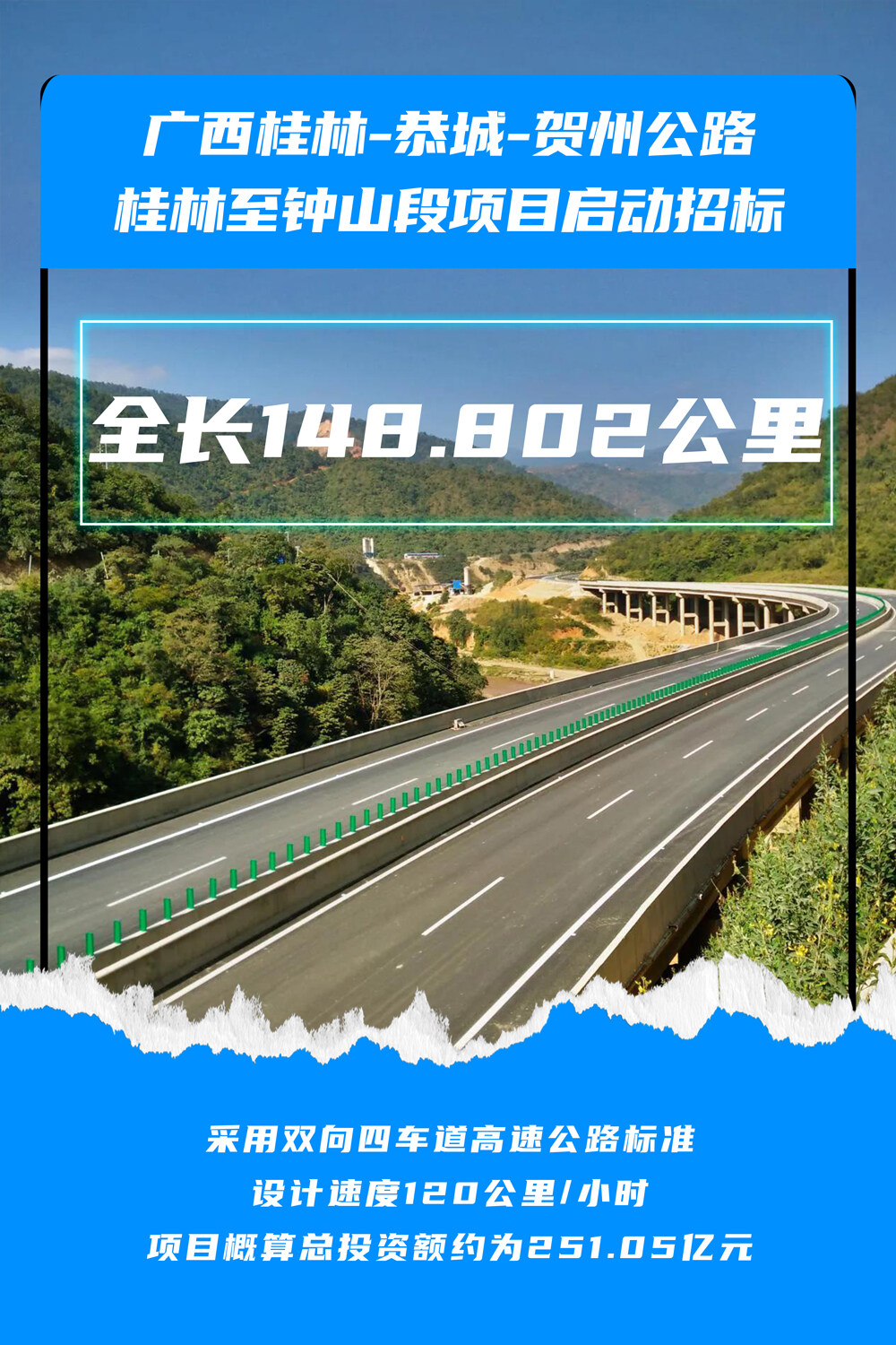 2022年7月25日,广西壮族自治区公共资源交易中心发布桂林-恭城-贺州公路桂林至钟山段融资+工程总承包招标公告,项目投资人为广西交通投资集团有限公司,项目概算总投资额约为251.05亿元。