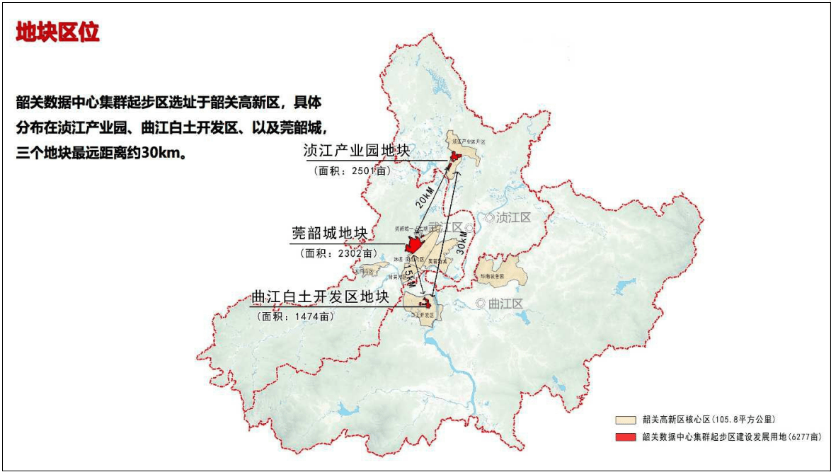 韶关数据中心集群起步区选址于韶关高新区,具体分布在浈江产业园、曲江白土开发区以及莞韶城。规划总用地面积约为418.51公顷。定位为打造全国一体化算力网络重要战略节点,全国一体化大数据中心集群融合发展、绿色低碳的创新样板标杆。以“绿色集约、统筹调度、数据融通、创新应用、安全可靠”为目标,至2025年底,基本形成布局合理、技术先进、绿色低碳、算力规模与数字经济增长相适应的新型数据中心发展格局,集群综合承载能力达到50万标准机架规模,PUE及可再生能源使用率达到国家领先水平,成为全国一体化大数据中心协同创新样板标杆。