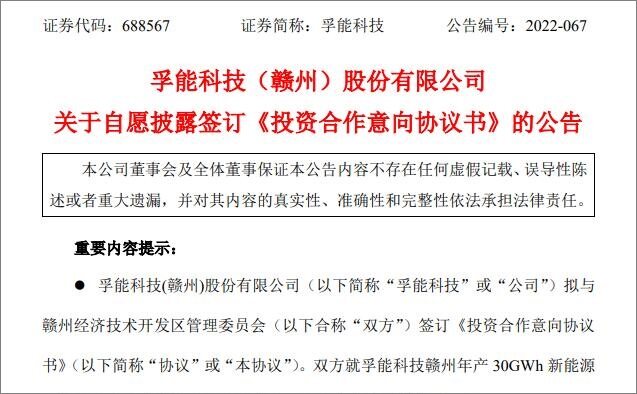 On August 1, 2022, Funeng Technology and the Ganzhou Economic and Technological Development Zone Management Committee signed the "Letter of Intent for Investment Cooperation", and the two parties reached an agreement on the relevant terms of the annual output of 30GWh new energy battery project in Ganzhou, Jiangxi Province of Funeng Technology. The project is divided into two phases. It is planned to be located in Ganzhou New Energy Science and Technology City, Jiangxi Province, with a total area of about 1,143 acres. After the project is completed, it can achieve an annual production capacity of 30GWh of new energy batteries.