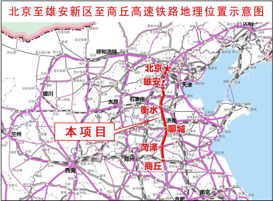 新建北京至雄安新区至商丘高速铁路雄安新区至商丘段是京港台通道的重要组成部分,线路位于京沪高速铁路、京广客运专线两大干线之间,基本沿既有京九通道,线路北起京雄城际铁路雄安站,经河北省雄安新区、沧州市、衡水市、邢台市,山东省聊城市,河南省濮阳市,山东省济宁市、菏泽市至河南省商丘市,接入商合杭高铁商丘站,正线全长552.5km。同步建设本线与石济客专北东、西南联络线18.5km,雄安站至津保铁路天津方向联络线11.9km,雄安动车所增设检查库线、存车线,改建商丘地区相关既有线。项目总投资827.1亿元,建设工期4年。