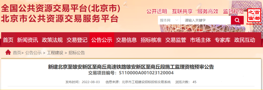 2022年8月3日,《新建北京至雄安新区至商丘高速铁路雄安新区至商丘段施工监理招标资格预审公告》在北京市公共资源交易平台发布。标志着京港高速铁路雄安至商丘段即将进入正式施工阶段。