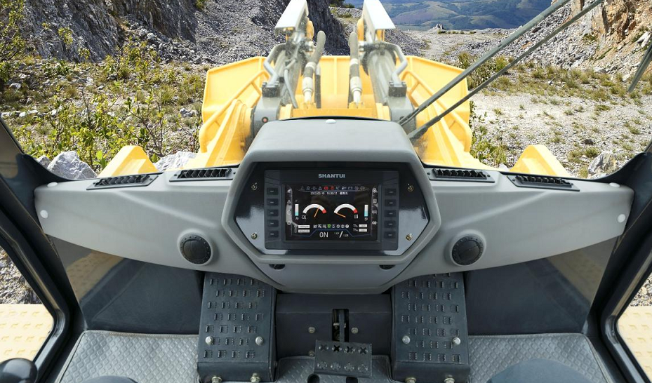 DL300-G工作装置液控单手柄控制,拥有集成自动举升、收斗按钮,控制精确,操作简便;配置8 寸智能显控终端,可进行多项人性化控制设置;驾乘空间宽大、视野开阔、各操作位置布置合理,座椅充分采用人机工程学设计,配置冷暖空调,可为操作者提供方便舒适的操控环境。