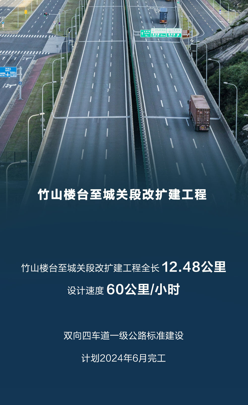 本项目采用双向四车道一级公路标准,设计速度采用60公里/小时,路基宽度20米。项目全线挖方187.74万立方米,填方11.72万立方米,共设置中桥4座184延米,新建短隧道295米/1座(半幅)。项目总投资37596万元,建设工期24个月,计划2022年8月开工,2024年7月完工。