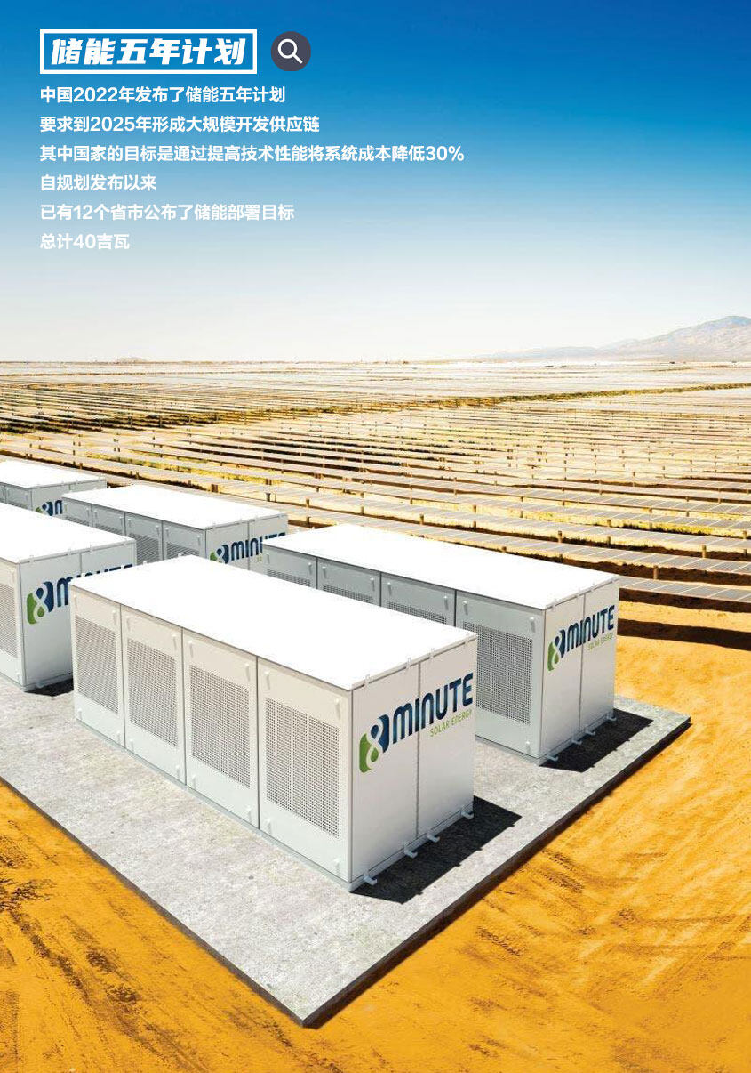 中国2022年发布了储能五年计划,要求到2025年形成大规模开发供应链,其中国家的目标是通过提高技术性能将系统成本降低30%。自规划发布以来,已有12个省市公布了储能部署目标,总计40吉瓦。