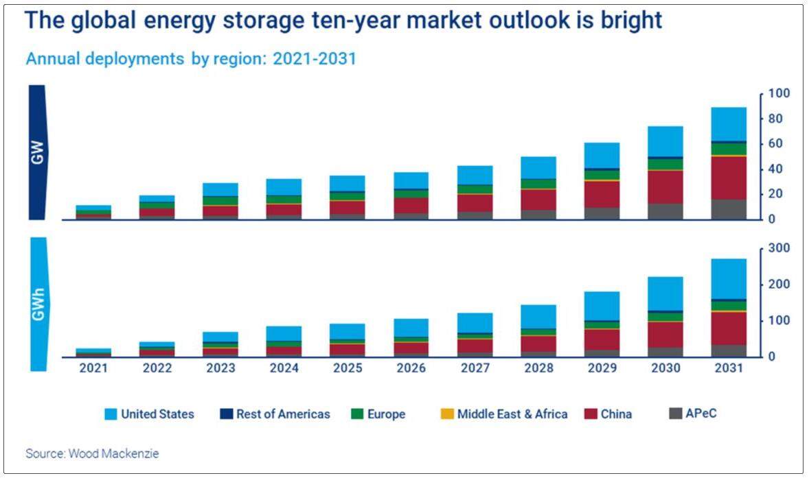 随着可再生能源在电网中发挥越来越重要的作用,储能建设也迅速落后。Wood Mackenzie表示,预计到2031年全球部署500吉瓦,中国和美国占全球需求的75%。