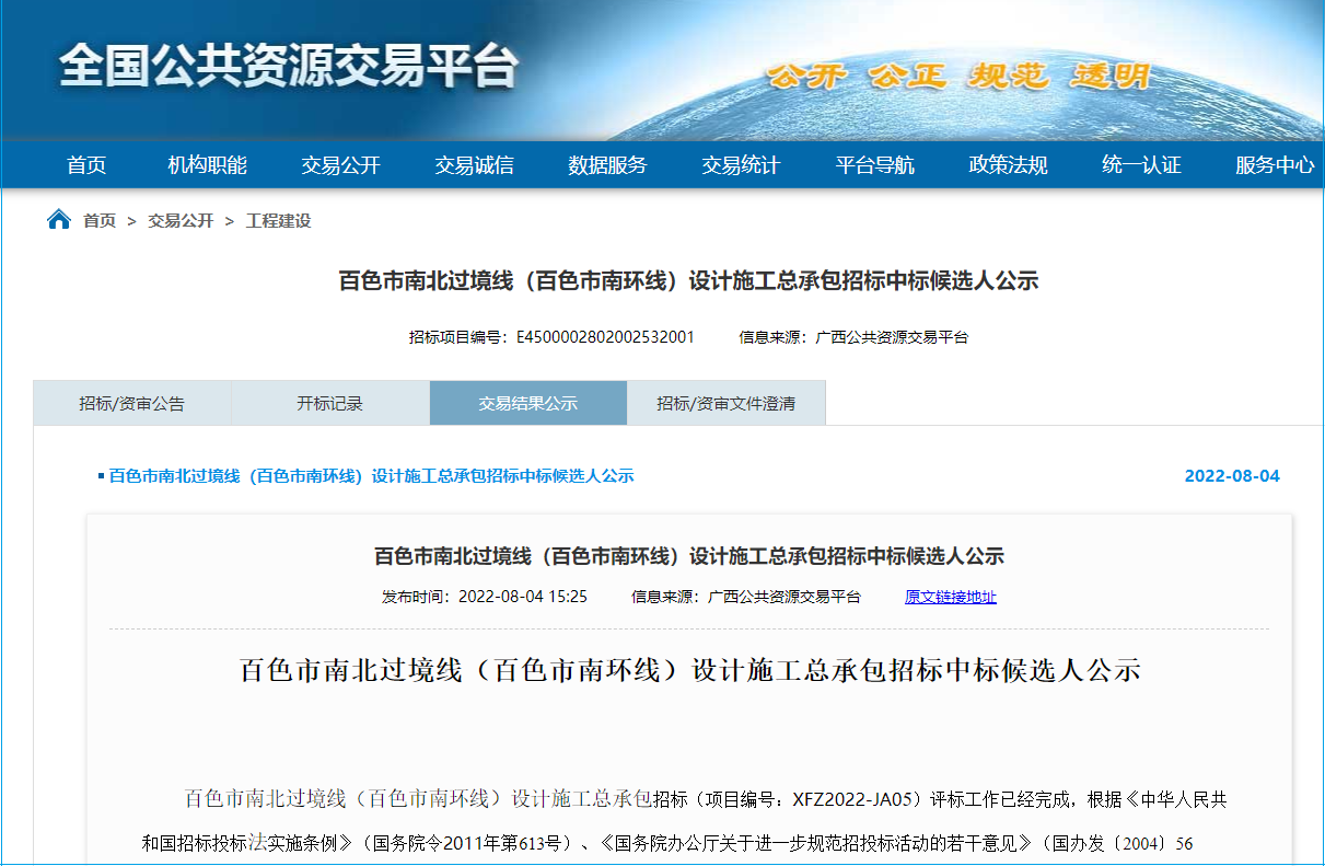 On August 4, 2022, the Public Resources Trading Center of Guangxi Zhuang Autonomous Region released the announcement of the winning candidates for the general contracting of the design and construction of the north-south border crossing line in Baise City. The consortium is expected to win the bid price of 3.068 billion yuan.