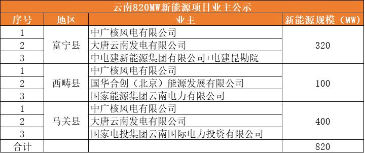 为进一步贯彻落实省委省政府着力打造世界一流绿色能源牌战略,持续做大做优绿色能源产业,全力推进绿色能源高质量发展, 近日云南省各地相继公示了新能源开发投资业主。其中包括云南富宁县、云南西畴县、云南马关县,三个地方合计公示了820MW新能源项目。根据富宁县和西畴县的招标公告显示,项目按一定程序报批后,最终确定1家企业为项目业主,签订正式的投资协议;而马关县没有确定说明最终确定几家业主。