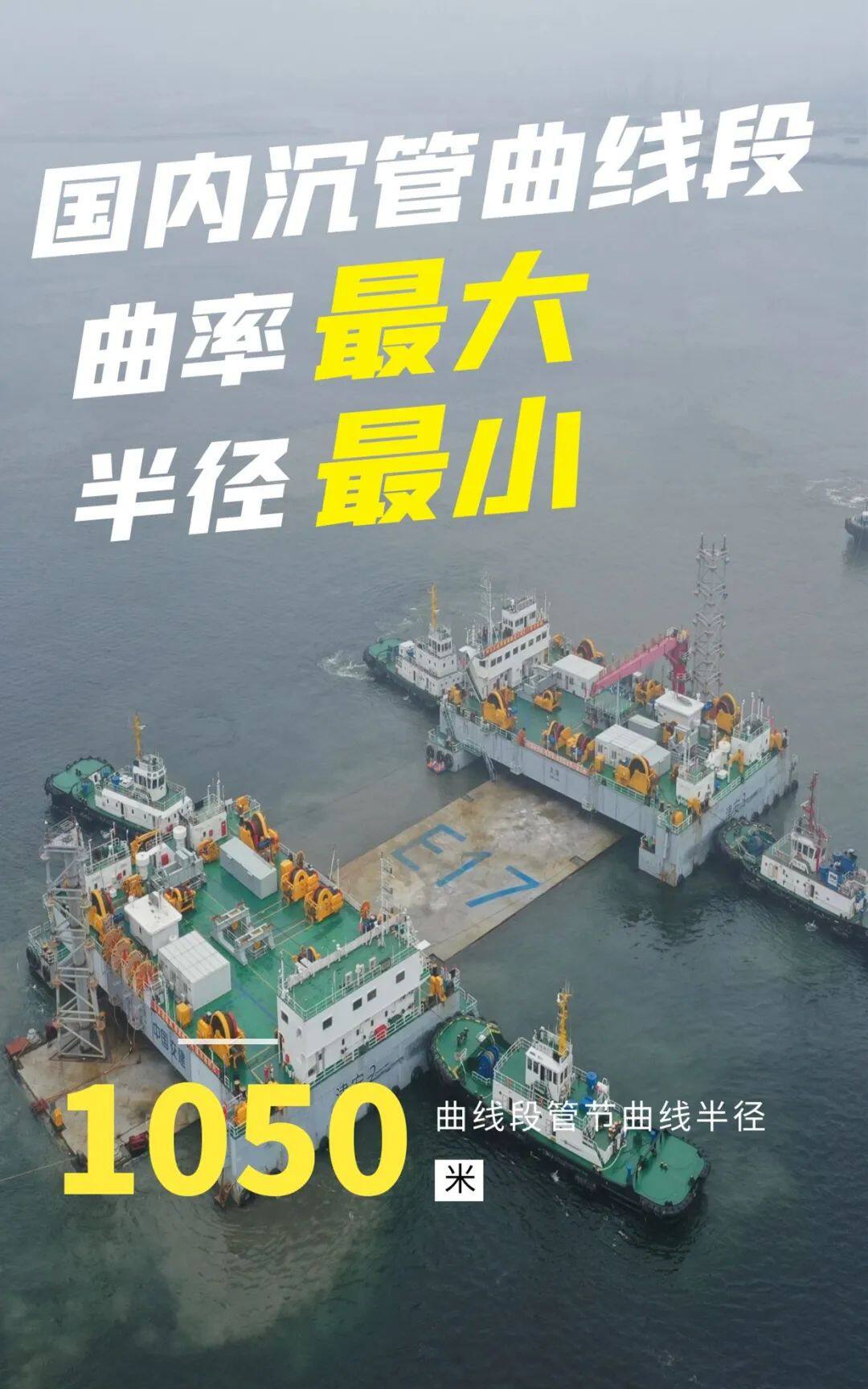 工程海底沉管段全长3035米,由18节沉管组成,其中,标准管节重约6万吨,相当于中型航母的排水量,曲线段曲线半径达到1050米,为中国曲率最大、半径最小的曲线段沉管隧道。