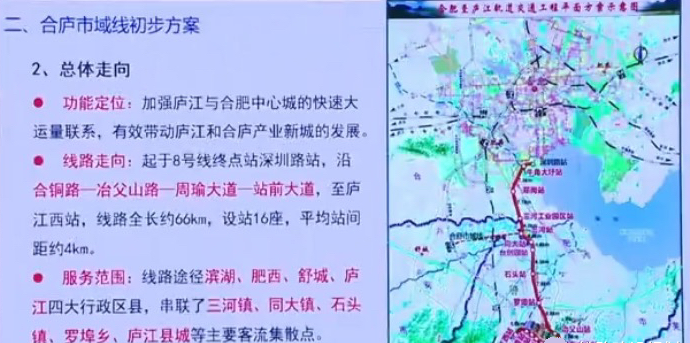 合庐市域铁路全长约74.2km,共设车站17座,线路从合肥市区轨道交通引出,经三河镇、同大镇、石头镇、罗埠镇、庐江县城到庐江西站,在石头镇设车辆段,在庐江县设停车场,投资估算约260亿元,其中工程费用为141亿元。
