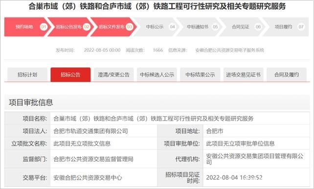 2022年8月5日,合肥市公共资源交易中心发布消息,合巢市域铁路和合庐市域铁路工程可行性研究及相关专题研究服务招标公告发布,招标人合肥市轨道交通集团有限公司。这两个项目正式启动前期工作。《合肥市十四五交通运输发展规划》曾明确提出,谋划合肥市域铁路建设,打造市域范围一小时通勤圈和生活圈。加快推进新桥机场S1线建设。强化合肥对合肥都市圈周边市县的辐射能力,加强中心城区与市县、市县之间的市域轨道连接。规划研究合肥-庐江、合肥-长丰-淮南、合肥-巢湖、合肥-六安、合肥-舒城万佛湖等市域铁路。