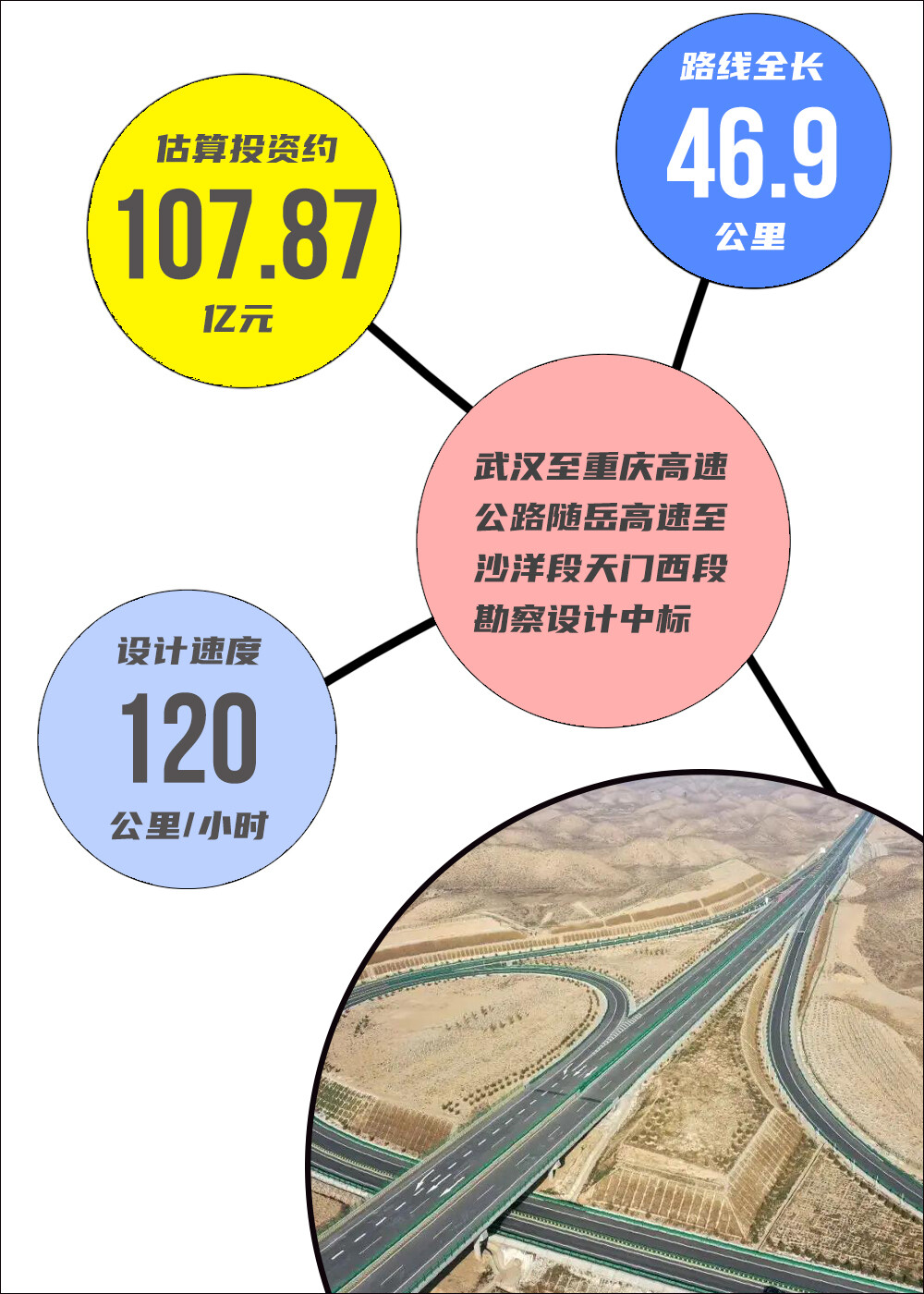 武汉至重庆高速公路随岳高速至沙洋段天门西段规划起于天门城区附近接随岳高速并对接武天高速公路城市圈环线至随岳高速段,经汪场、蒋场、多宝,止于天门、荆门交界并对接武天宜高速荆门段,为平原微丘高速公路。项目采用设计速度120km/h,路基宽度34m的双向六车道高速公路标准建设,路线全长46.9km。拟设桥梁32830m/32座,其中跨汉北河桥梁采用主跨120米的连续钢构,桥梁比约70%;拟设互通式立交5座,其中枢纽式互通1处,喇叭互通4处;拟设服务区1处、互通5处;项目估算投资约107.87亿元。