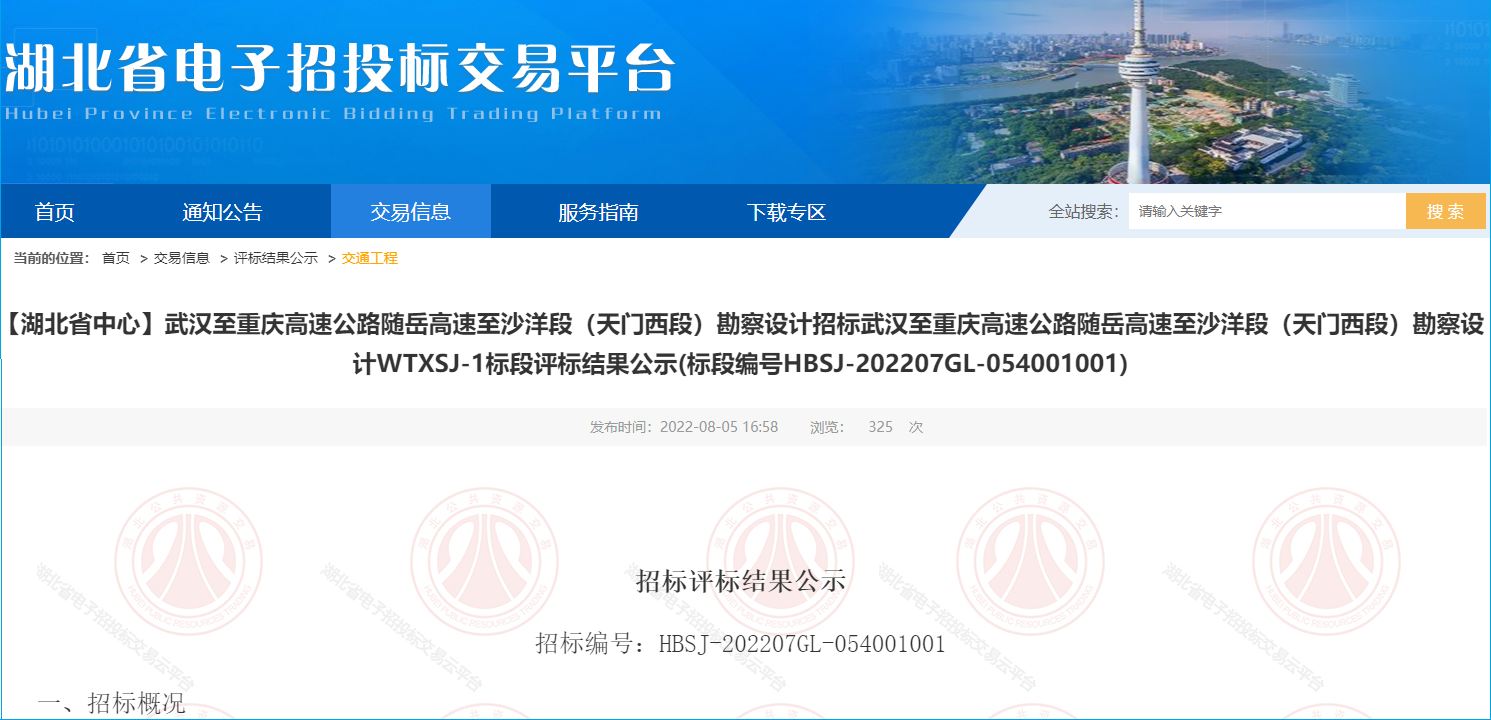 2022年8月5日,湖北省电子招投标交易平台发布了武汉至重庆高速公路随岳高速至沙洋段天门西段勘察设计WTXSJ-1标段评标结果公示,根据评标委员会提交的评标报告,天门市交通运输局已经确认评标结果,现进行评标结果公示。