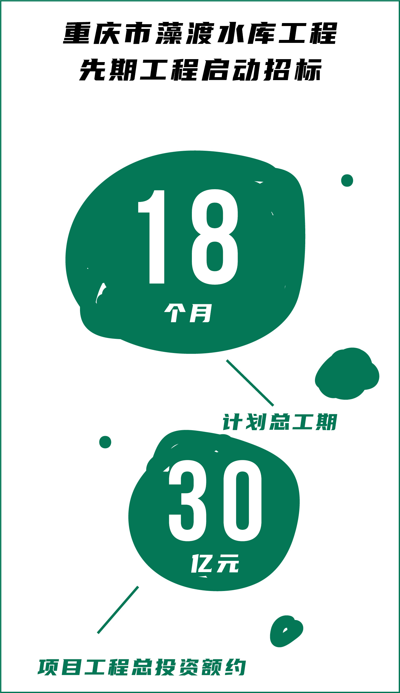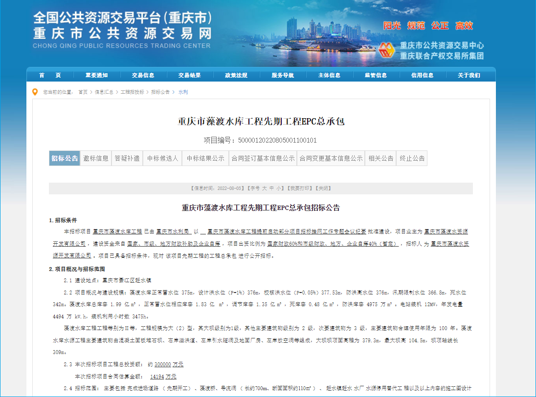 2022年8月5日,重庆市公共资源交易网发布重庆市藻渡水库工程先期工程EPC总承包招标公告,本招标项目已由重庆市水利局批准建设,招标人为重庆市藻渡水资源开发有限公司,项目工程总投资额约30亿元。