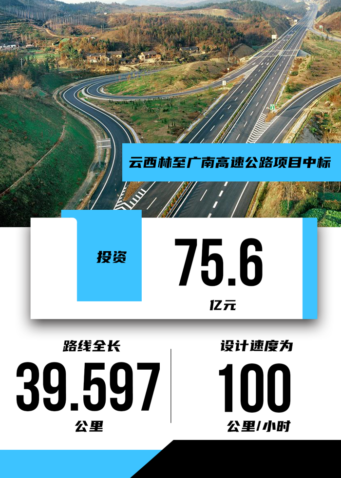 2022年8月8日,文山州交通运输局发布了西林至广南高速公路特许经营项目社会投资人中标候选人公示,本项目由云南建设基础设施投资股份有限公司等8家单位组成的联合体中标,合同估算价75.6亿元。