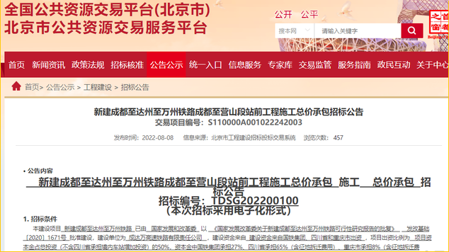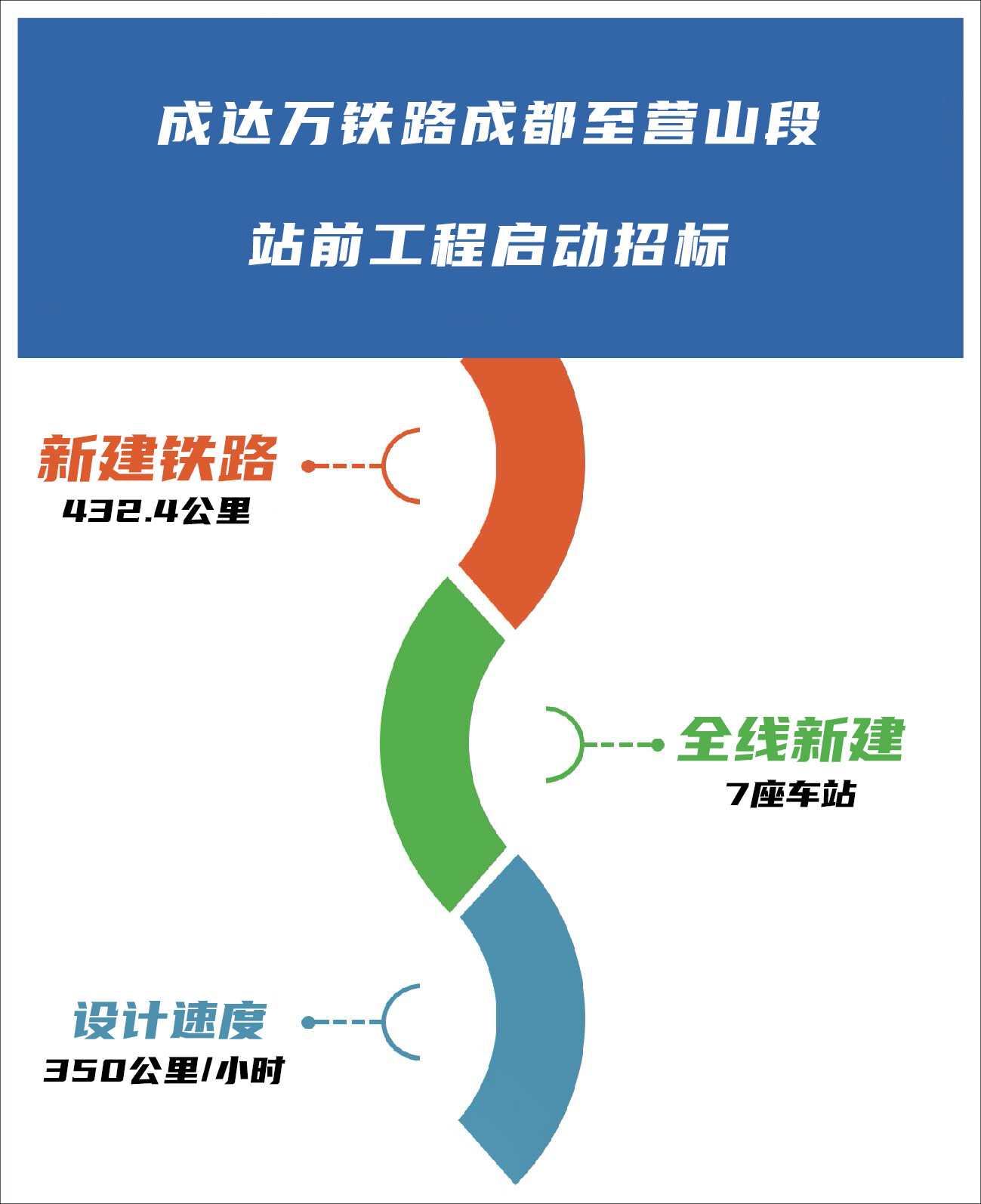 2022年8月8日,新建成都至达州至万州铁路成都至营山段站前工程施工总价承包招标公告在北京市公共资源交易平台发布,标志着成达万高铁成都至营山段即将进入全线正式施工阶段。根据公告,项目计划10月初开工,工期5年。营山至万州段预计不久也将招标。